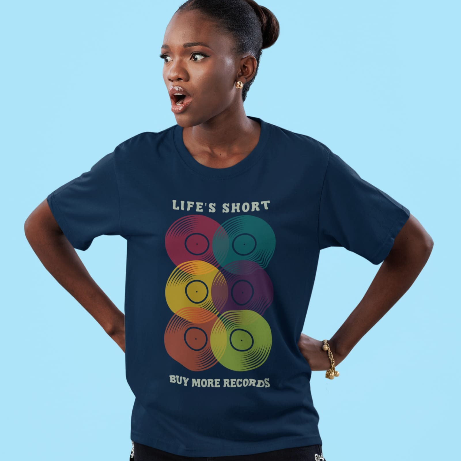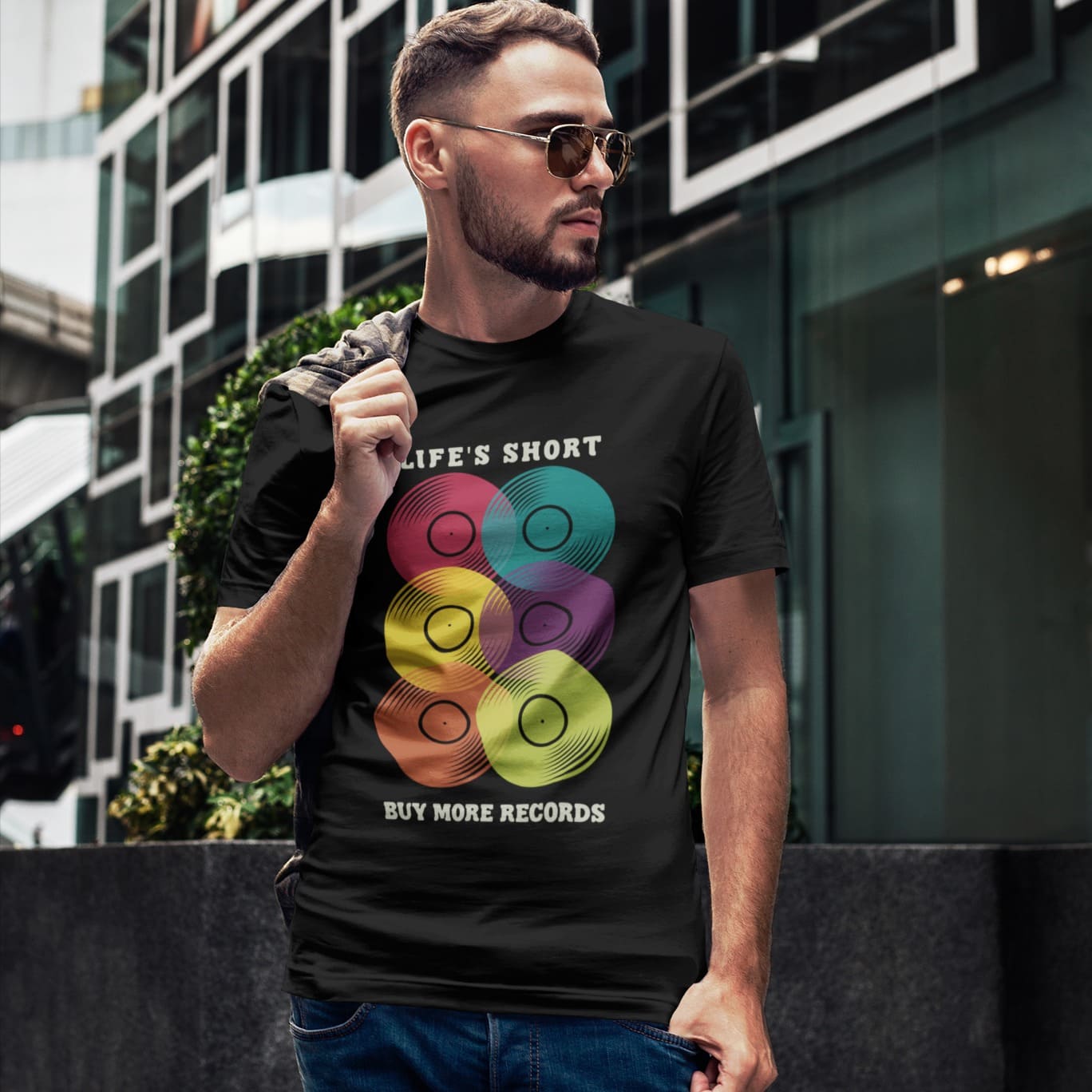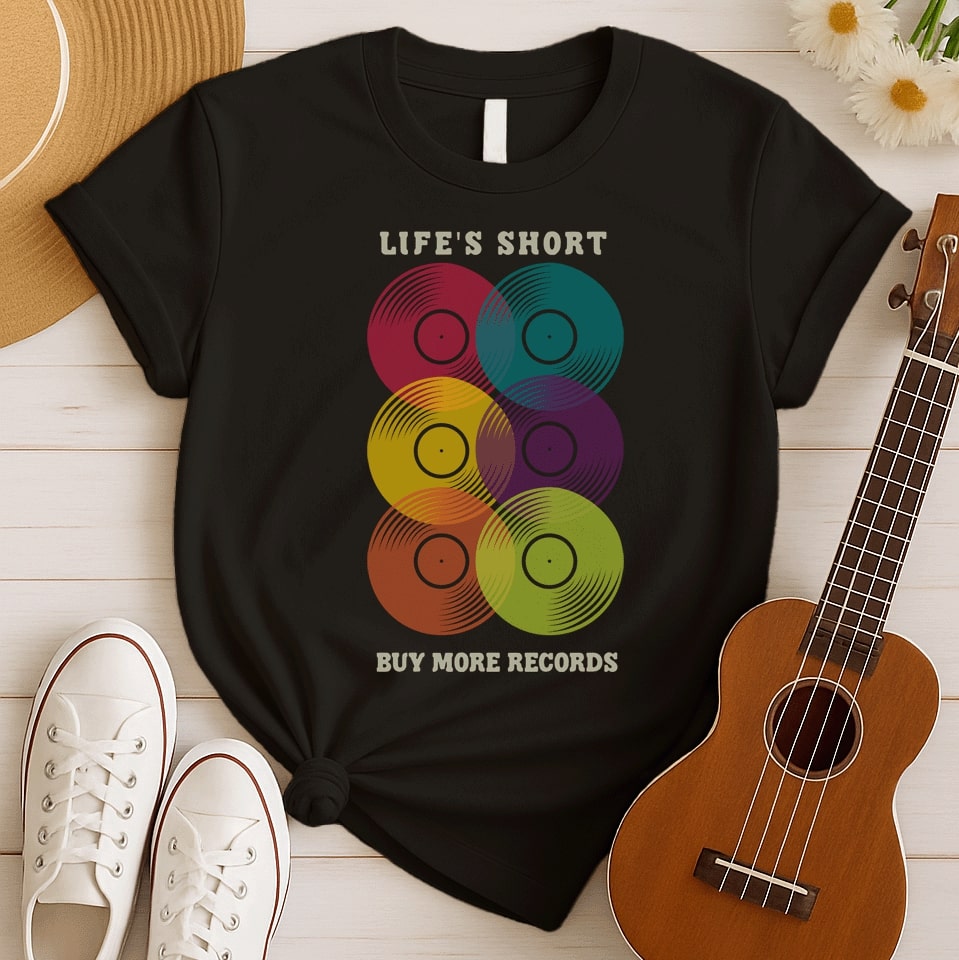 Life's short, so buy more records! This vibrant design is a must-have for every vinyl enthusiast, featuring a colorful stack of retro LPs. Express your passion for music collecting, the rich sound of analog, and that undeniable vintage vibe!