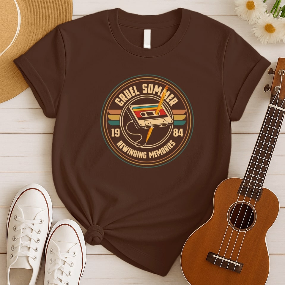 Step back to 1984! The Cruel Summer T-shirt features a vintage cassette tape graphic with a pencil, capturing the essence of Rewinding Memories. This retro tee is essential for 80s music lovers and anyone nostalgic for the mix tape era.