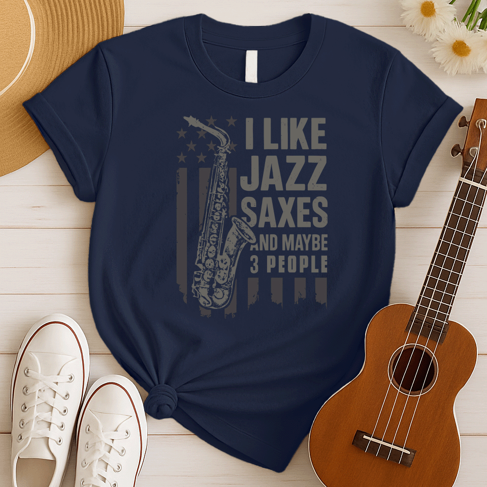 The perfect funny musician gift for any saxophone player or serious jazz lover! This design features a sax graphic on a cool, distressed flag background with the hilarious quote: "I like Jazz Saxes and maybe 3 people." Great for band teachers, band members, and anyone who appreciates sarcastic and vintage-style music apparel.