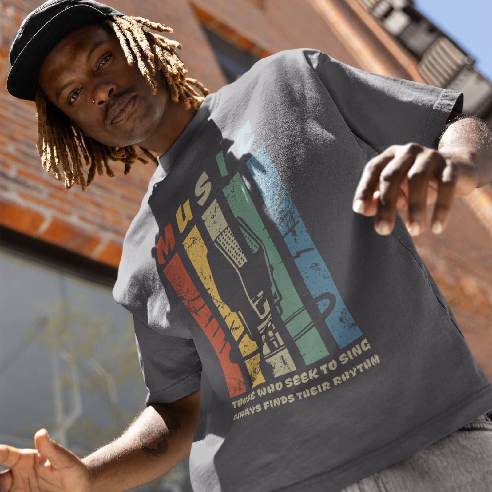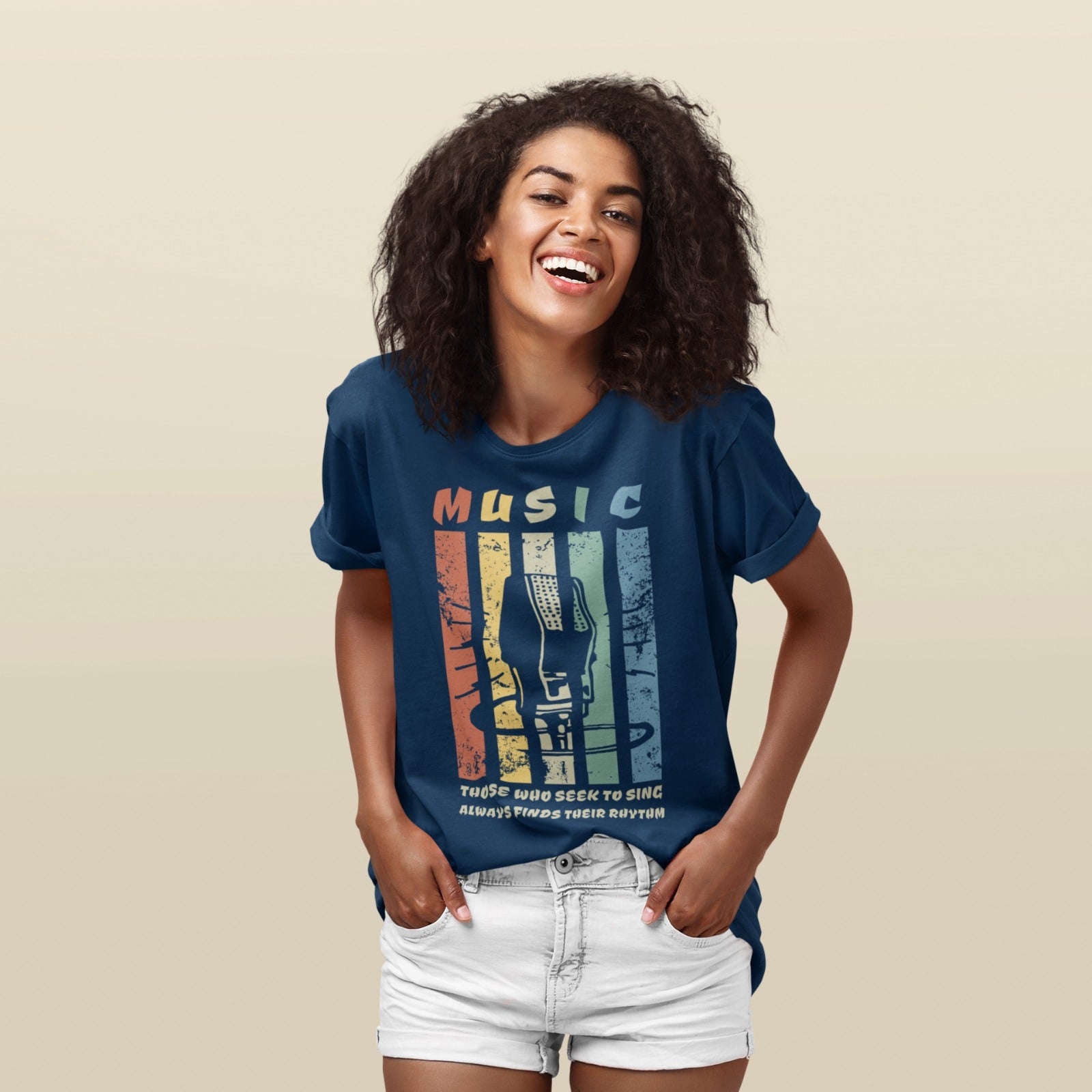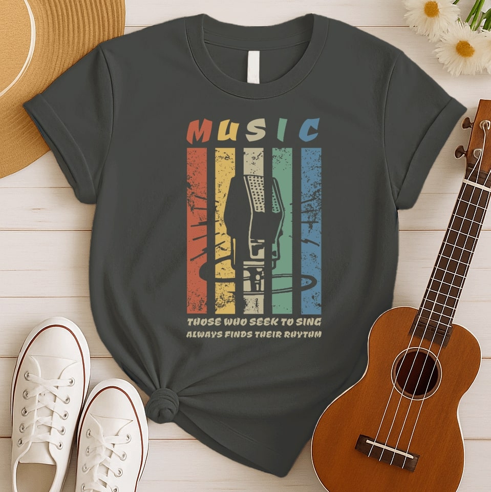 Unleash your inner melody! This vibrant "MUSIC" design, featuring a classic microphone against retro stripes, carries an inspiring message: "THOSE WHO SEEK TO SING ALWAYS FINDS THEIR RHYTHM". It's the perfect tee for every singer, musician, or music lover seeking their unique beat in life!