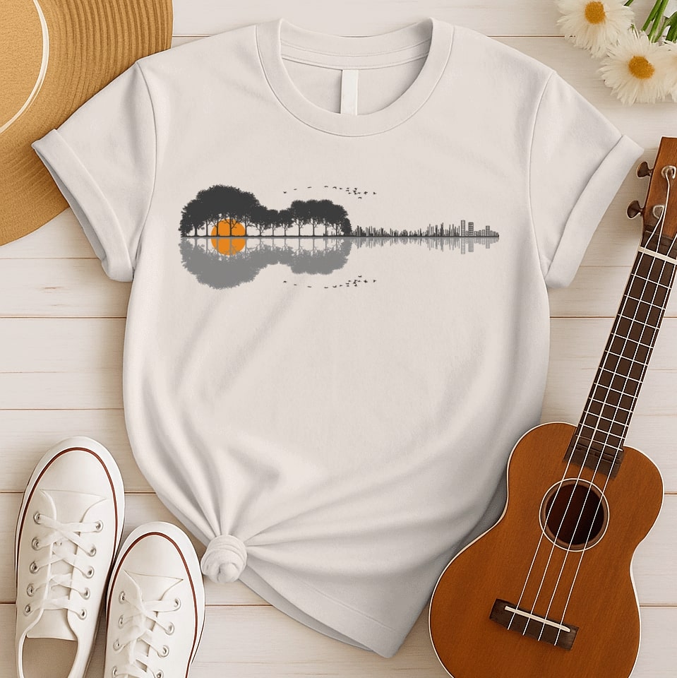 Immerse yourself in the soulful silence of music with this striking graphic design, where a forest acoustic guitar forms a serene urban soundwave art landscape. It's a peaceful statement for quiet music lovers, guitar players, and city nature enthusiasts finding harmony in their music apparel.
