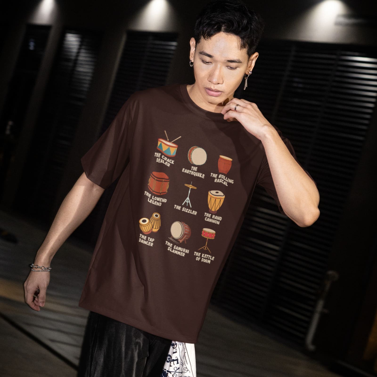 The ultimate shirt for the rhythm section! This hilarious design features a grid of different drums with funny, descriptive titles like "THE EARTHQUAKE" and "THE KETTLE OF DOOM." A perfect, unique gift for drummers, percussionists, band members, and anyone who appreciates a good music pun and retro graphic style.