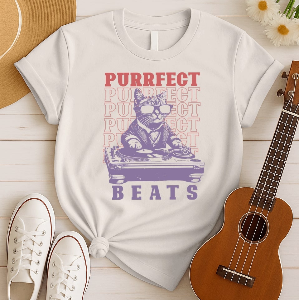 Get ready to drop some "Purrfect Beats"! This awesome design features a cool cat DJ in shades, masterfully spinning tracks on a turntable. With "PURRFECT BEATS" rocking the background, it's the ultimate tee for music lovers, DJs, and cat enthusiasts who live for the rhythm!