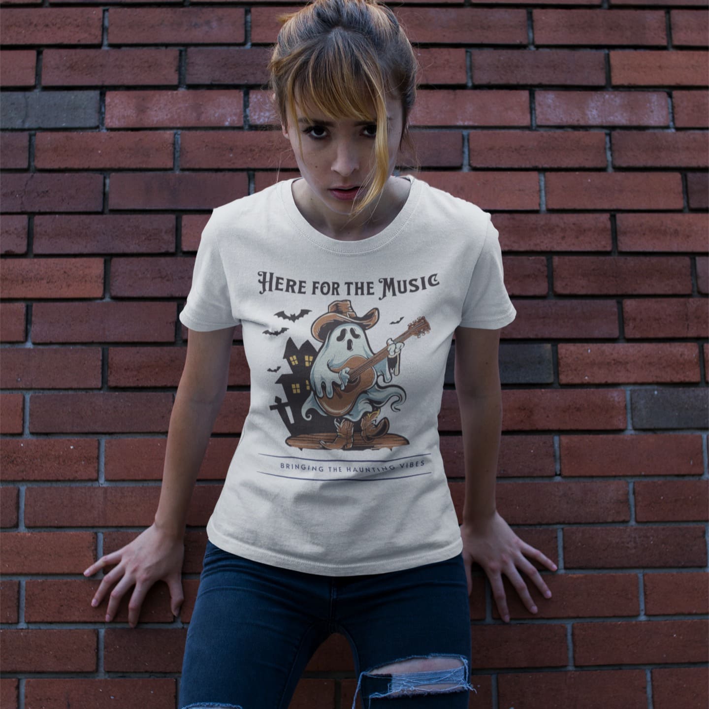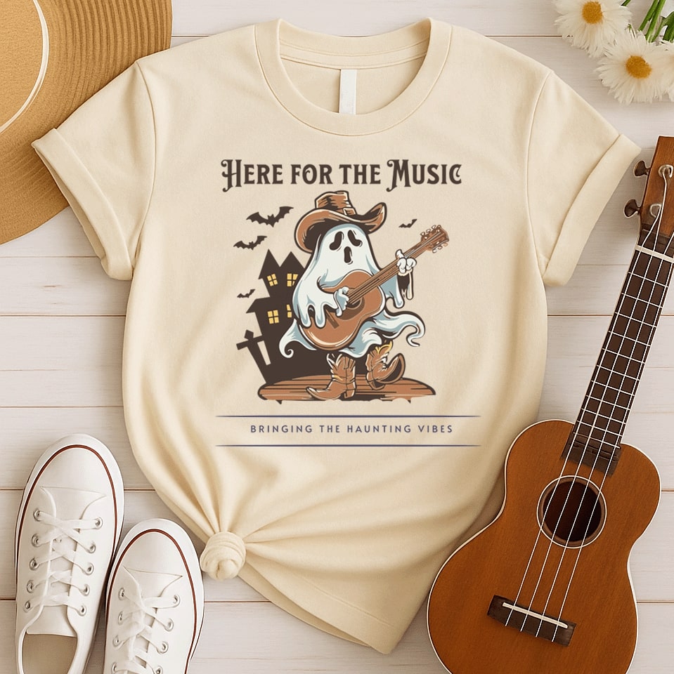 HERE FOR THE MUSIC, BRINGING THE HAUNTING VIBES! This charming design features a ghost in a cowboy hat and boots, strumming an acoustic guitar amidst a haunted house and flying bats. It's the perfect Halloween music tee for guitar lovers and anyone who enjoys spooky tunes!