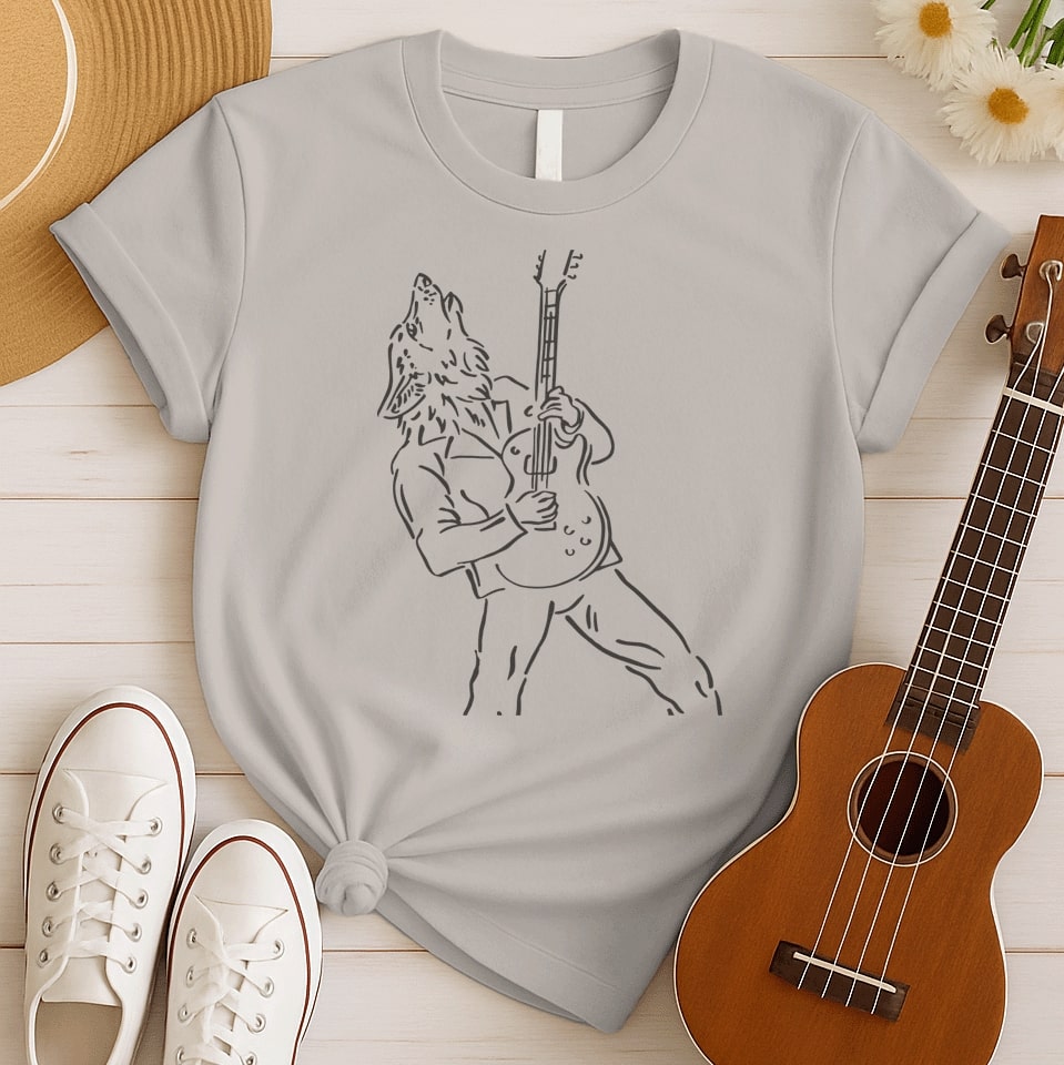 Unleash your wild musical spirit with this bold outline design! Featuring a howling wolf passionately playing an electric guitar, it evokes raw rock energy and untamed passion. This unique music graphic is an epic statement for music lovers, guitarists, and anyone with a wild soul for sound.