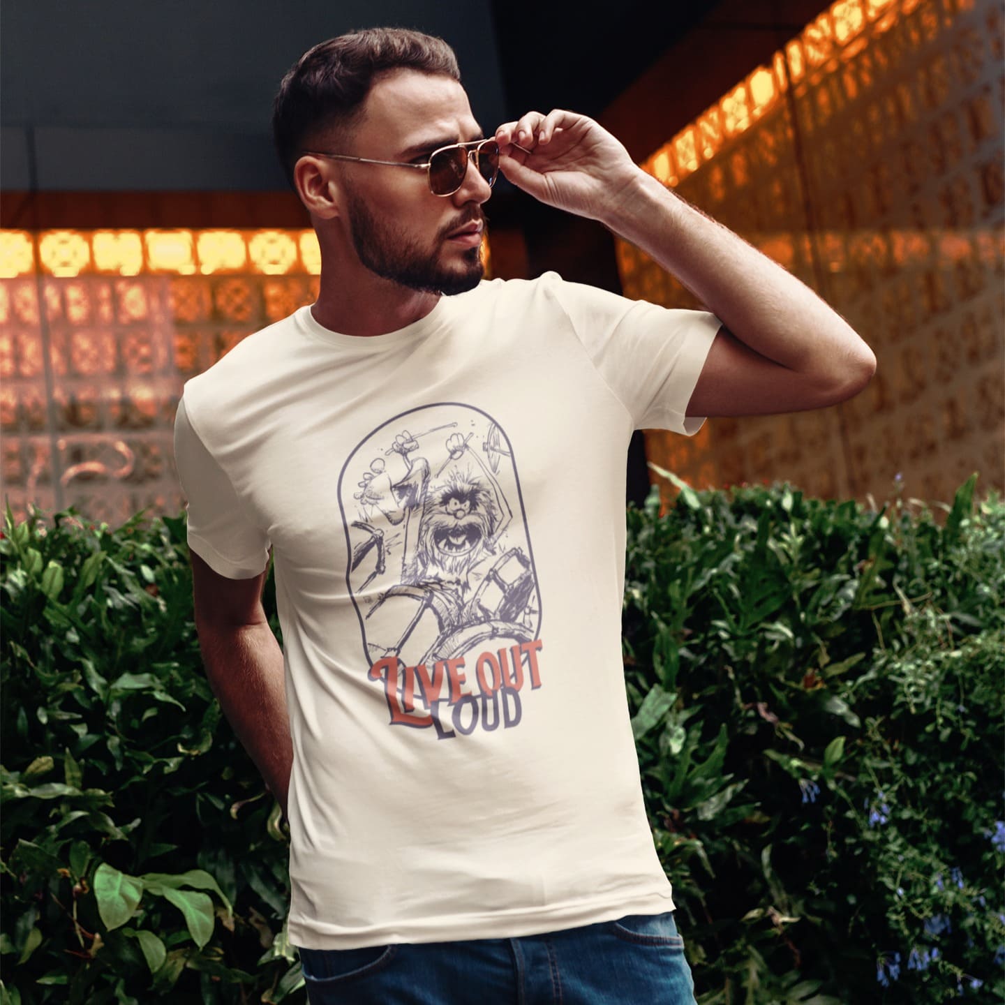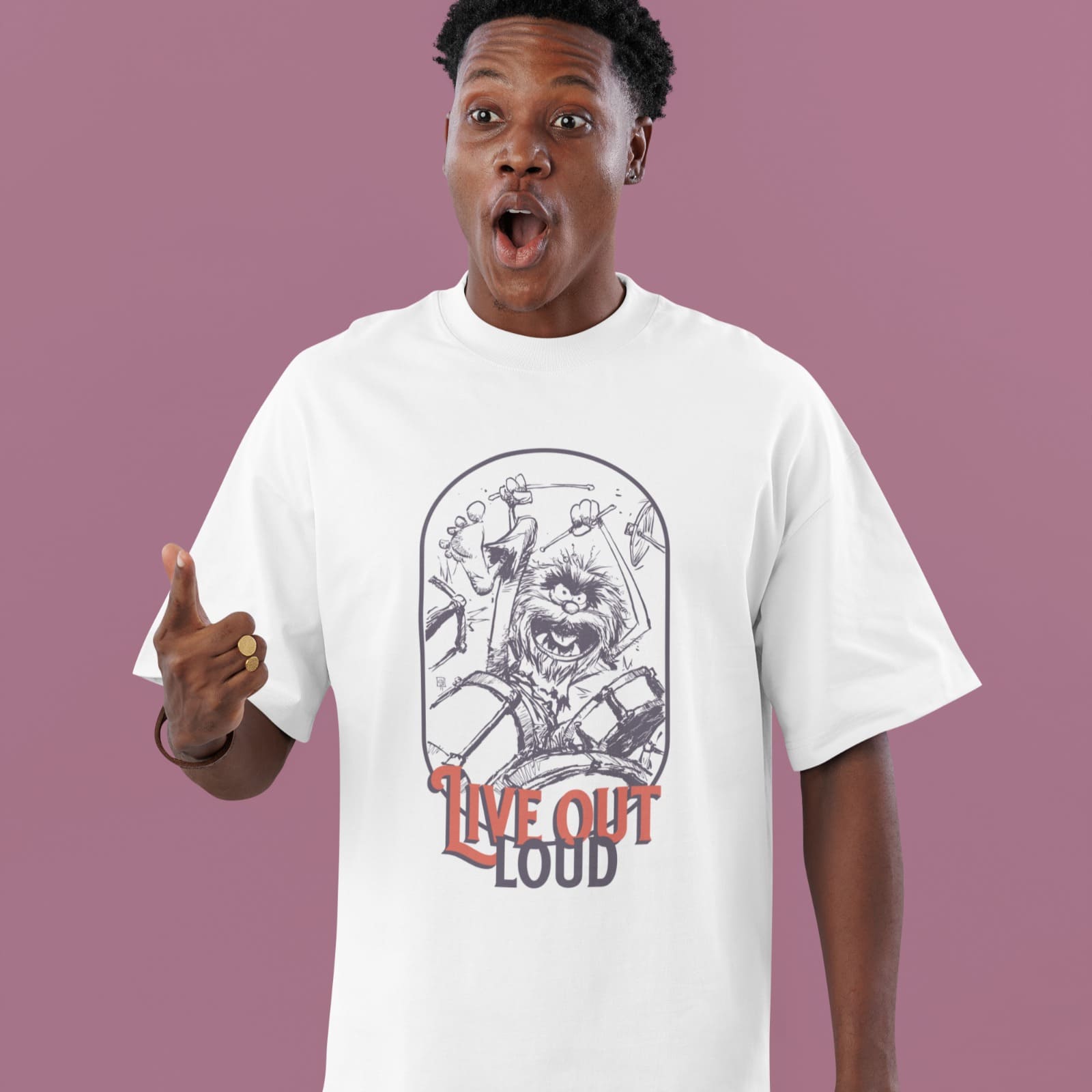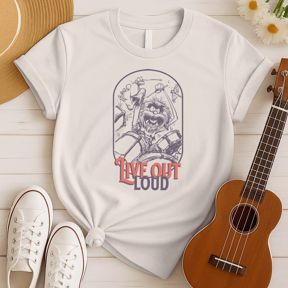 LIVE OUT LOUD with this electrifying design! Featuring a wild, shaggy monster absolutely crushing the drums, this tee is a tribute to raw energy and unbridled passion. Perfect for drummers, rock and metal fans, and anyone who believes in the power of loud music and living life to the fullest!