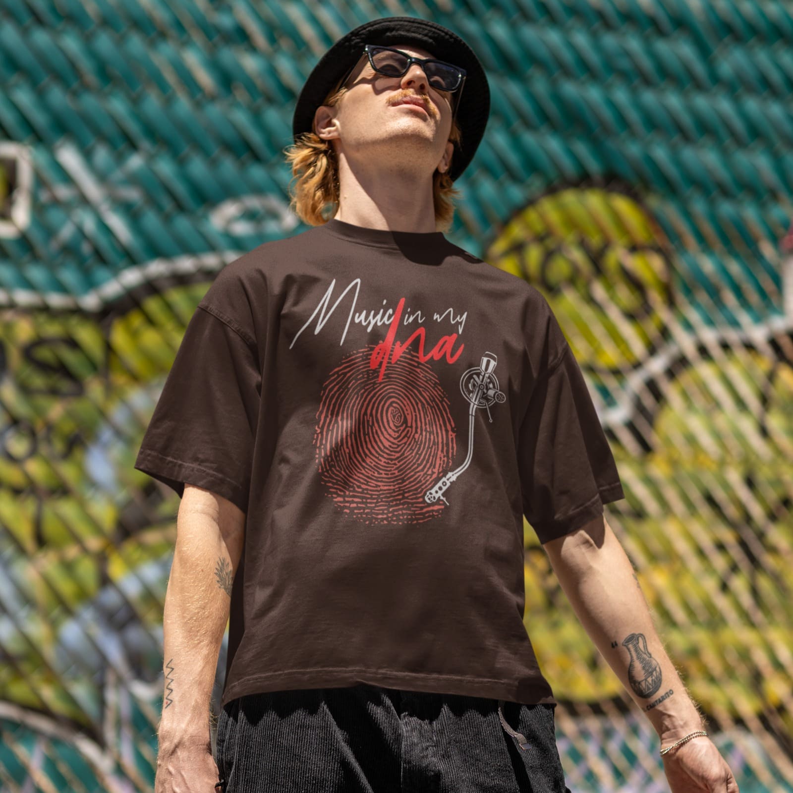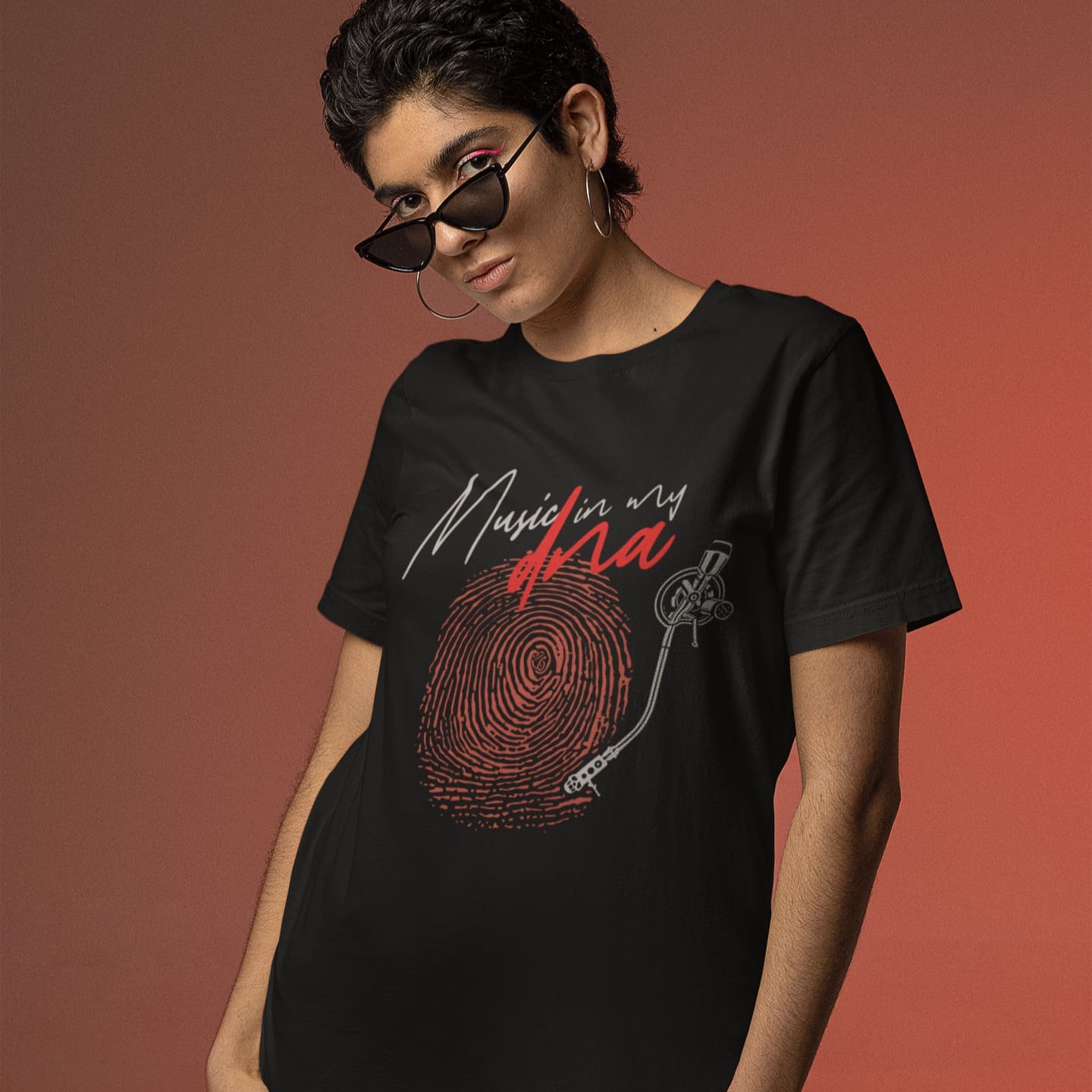 Discover the design that truly says "Music in my dna"! This unique graphic features a distinctive fingerprint transformed into a vinyl record groove, complete with a turntable tonearm. It's the ultimate expression for anyone whose soul beats to the rhythm of their favorite tunes. Your music identity starts here!