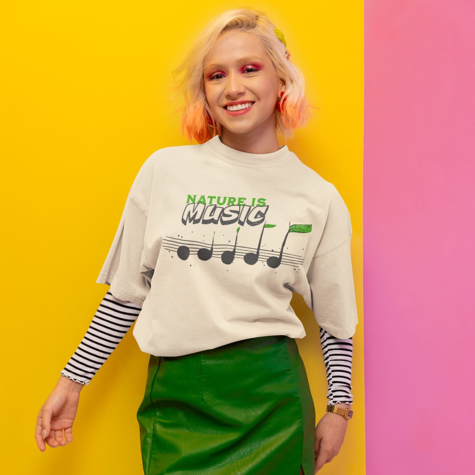 Discover the perfect harmony! This "NATURE IS MUSIC" design beautifully blends a musical staff with growing leaves for notes, celebrating the serene connection between the natural world and melody. It's the ideal tee for every nature lover, musician, and anyone who finds the earth's sounds to be pure music!