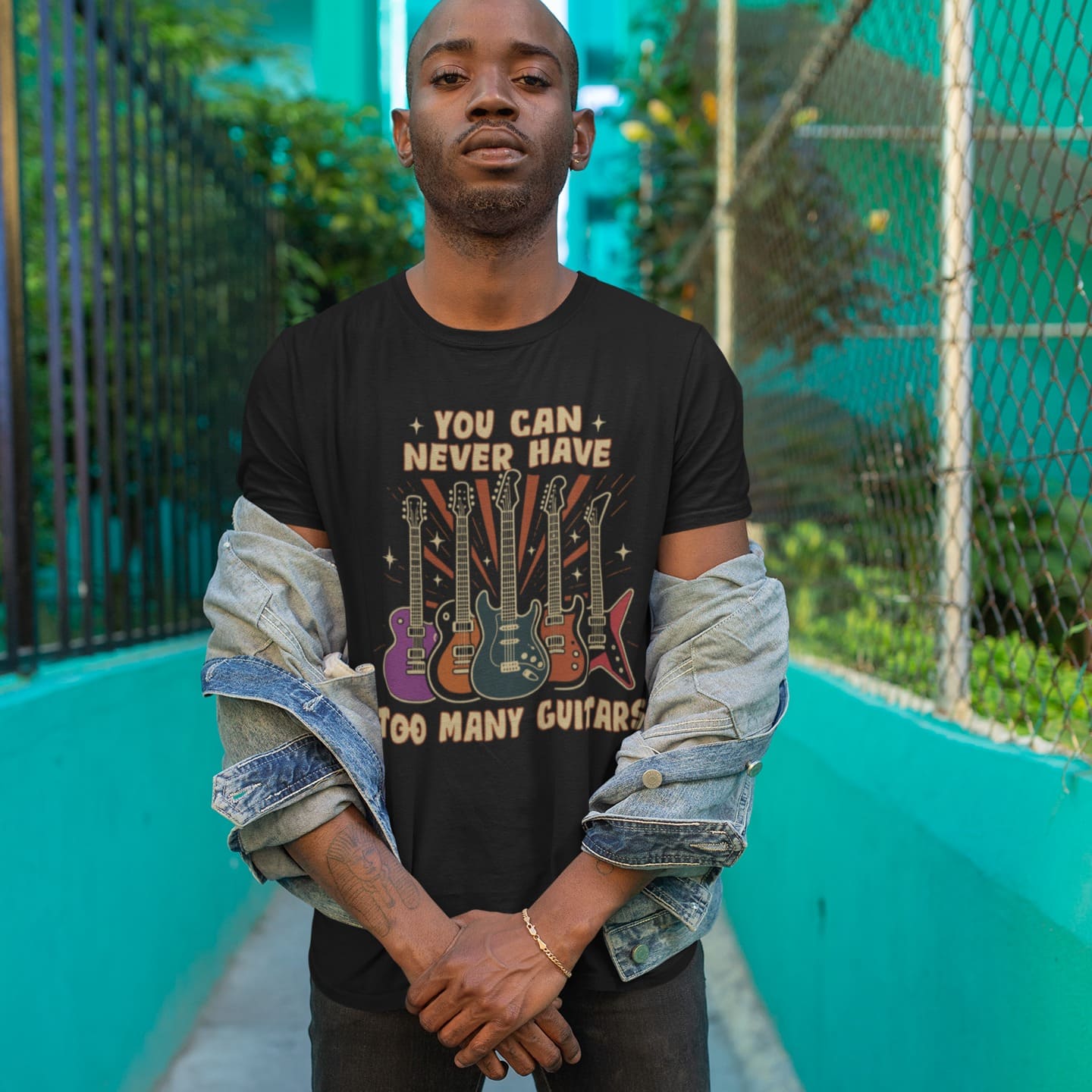 It's the Golden Rule! The "You Can Never Have Too Many Guitars" T-shirt features a bold graphic of five colorful electric guitars. This funny tee is a perfect statement for any guitar player, musician, or collector.