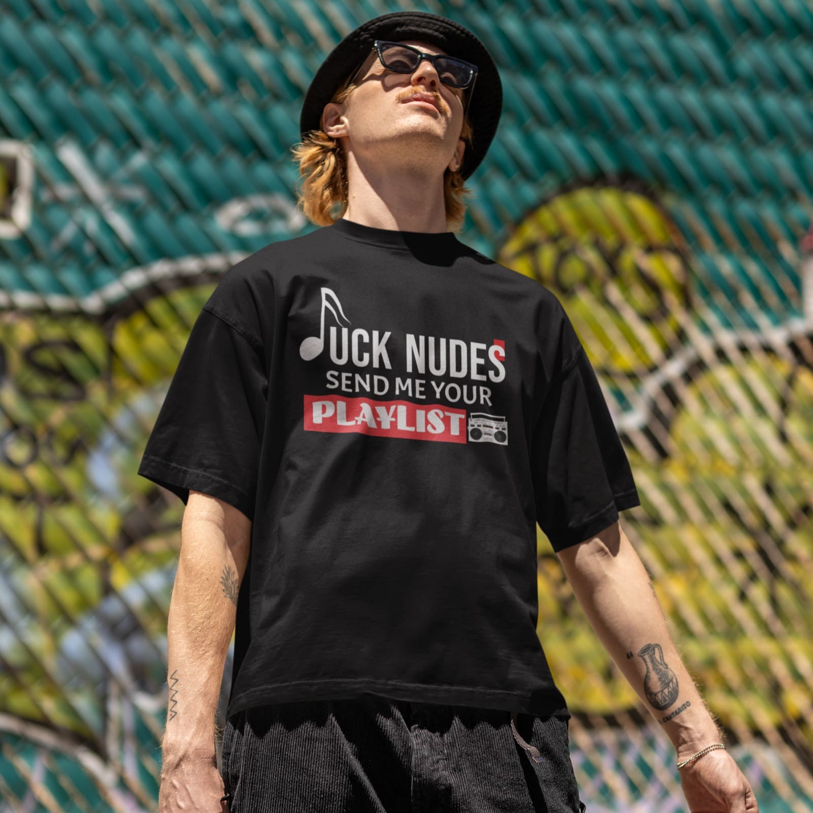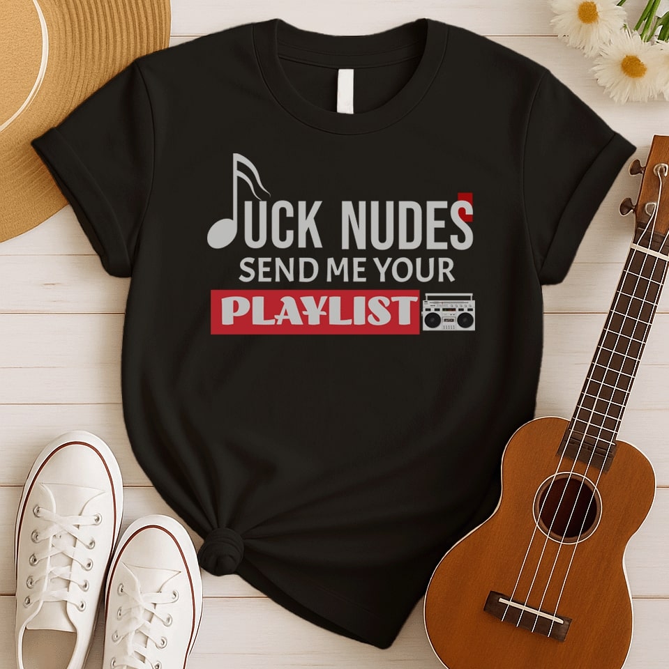 Make your priorities clear: F**K NUDES SEND ME YOUR PLAYLIST"! This bold and humorous design features an iconic boombox and a clever musical note graphic, declaring your ultimate devotion to tunes over everything else. It's the perfect statement tee for every passionate music lover, DJ, or anyone whose heart beats for the next great playlist!