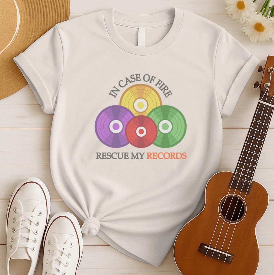 IN CASE OF FIRE, RESCUE MY RECORDS! This vibrant design features a stack of colorful vinyl records, making a clear statement about what truly matters. It's the ultimate tee for every music lover, record collector, and audiophile who cherishes their music collection above all else!