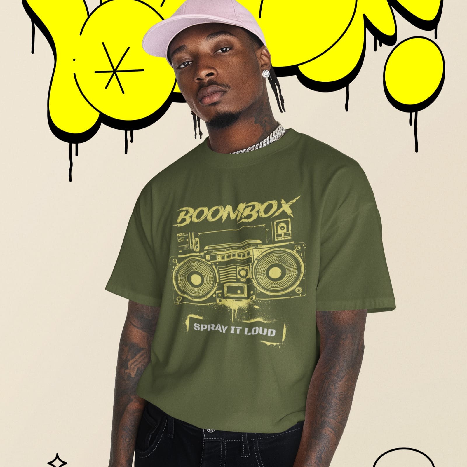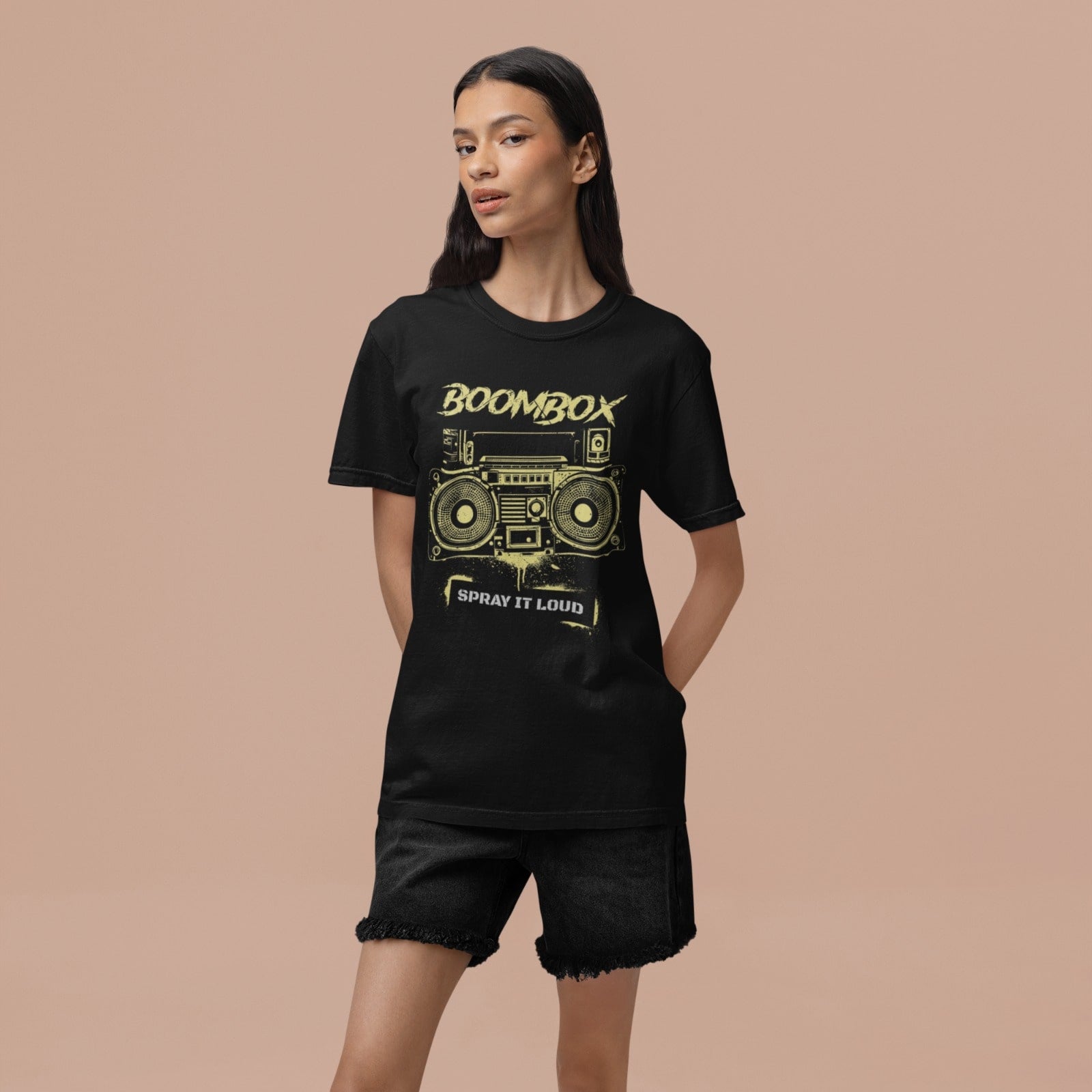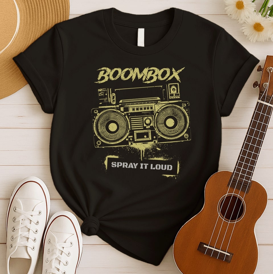Turn up the volume! This awesome "BOOMBOX" design captures the essence of retro music culture with its distressed, graphic style and iconic phrase "SPRAY IT LOUD". Featuring a classic boombox, it’s the ultimate tee for hip-hop fans, 80s enthusiasts, and anyone who believes music should be heard!