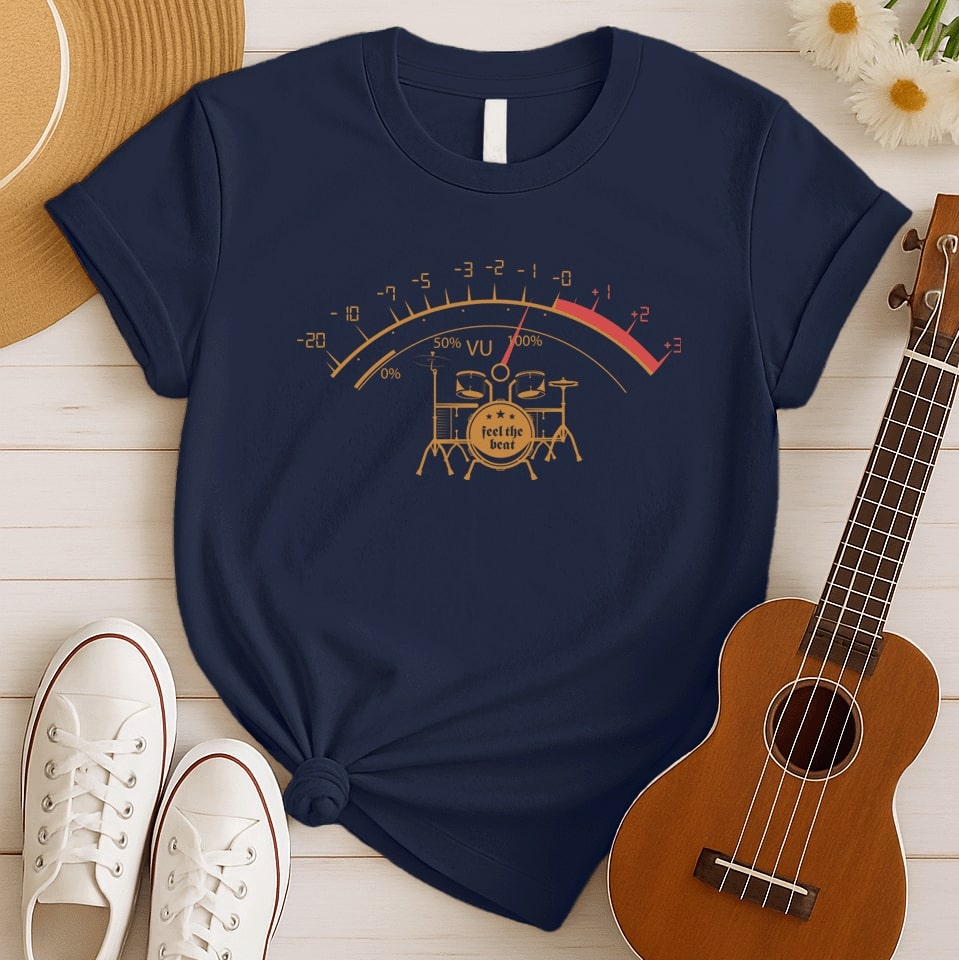 Measure your passion for sound with this eye-catching retro VU meter and drum kit graphic tee. A perfect, stylish statement for audio enthusiasts, drummers, and anyone who appreciates vintage music gear.