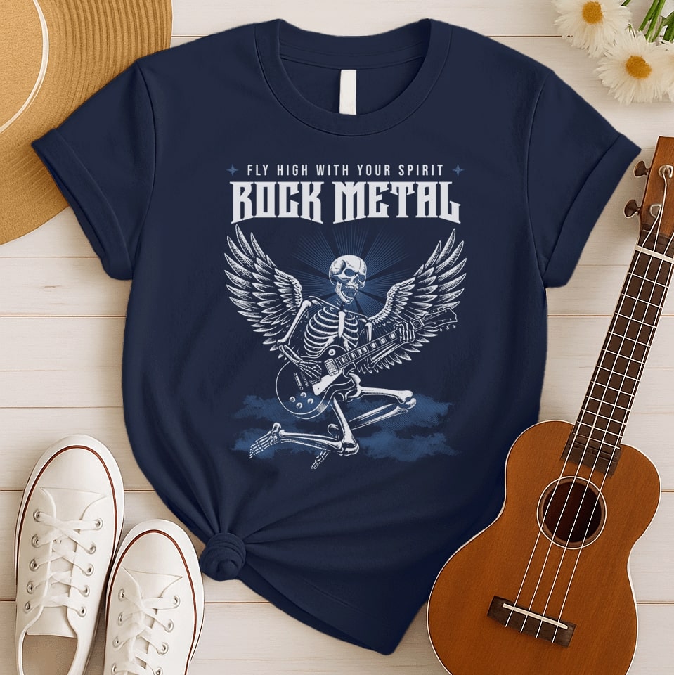 Unleash your inner rock spirit with this intense design! Featuring a winged skeleton playing a guitar, it embodies the power and energy of rock metal. "Fly high with your spirit" and dominate the stage of life with this ultimate heavy metal fan statement.