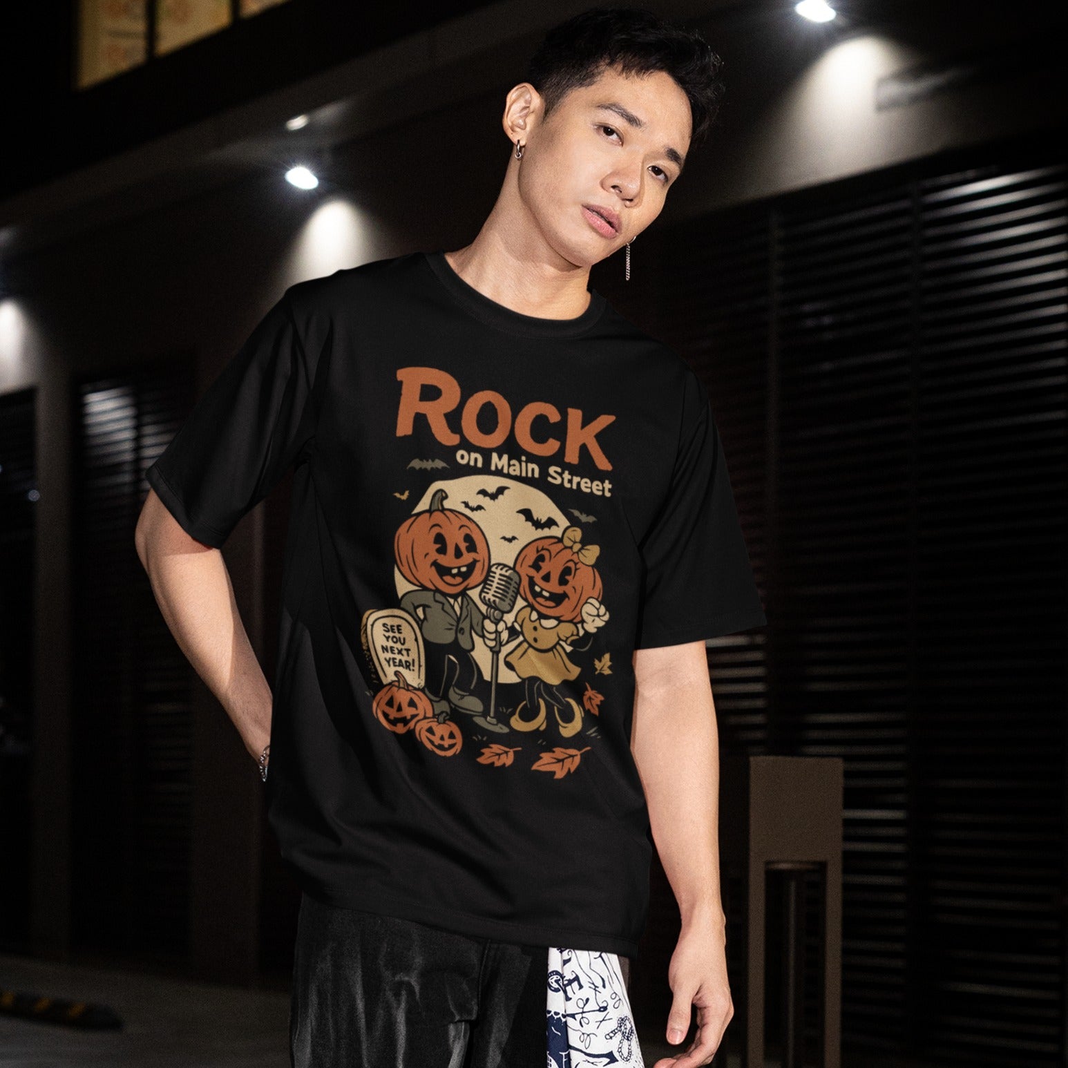 Celebrate spooky season with this Rock on Main Street Halloween retro t-shirt. Featuring vintage pumpkin characters rocking out under the moon, it’s perfect for music lovers, Halloween parties, and fans of nostalgic rock vibes.