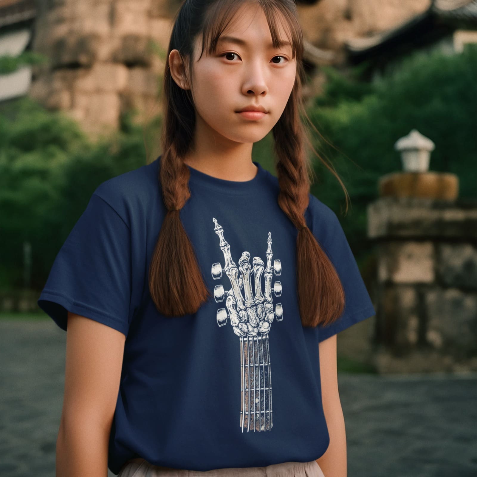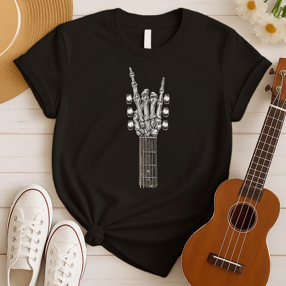 Unleash your inner rockstar with this striking design, featuring a skeleton hand throwing up the iconic "rock on" sign from a guitar neck. It's a powerful statement for rock music fans, guitar players, and anyone who believes their passion for music is truly undying. This unique music graphic captures the spirit of the stage and raw musical energy.