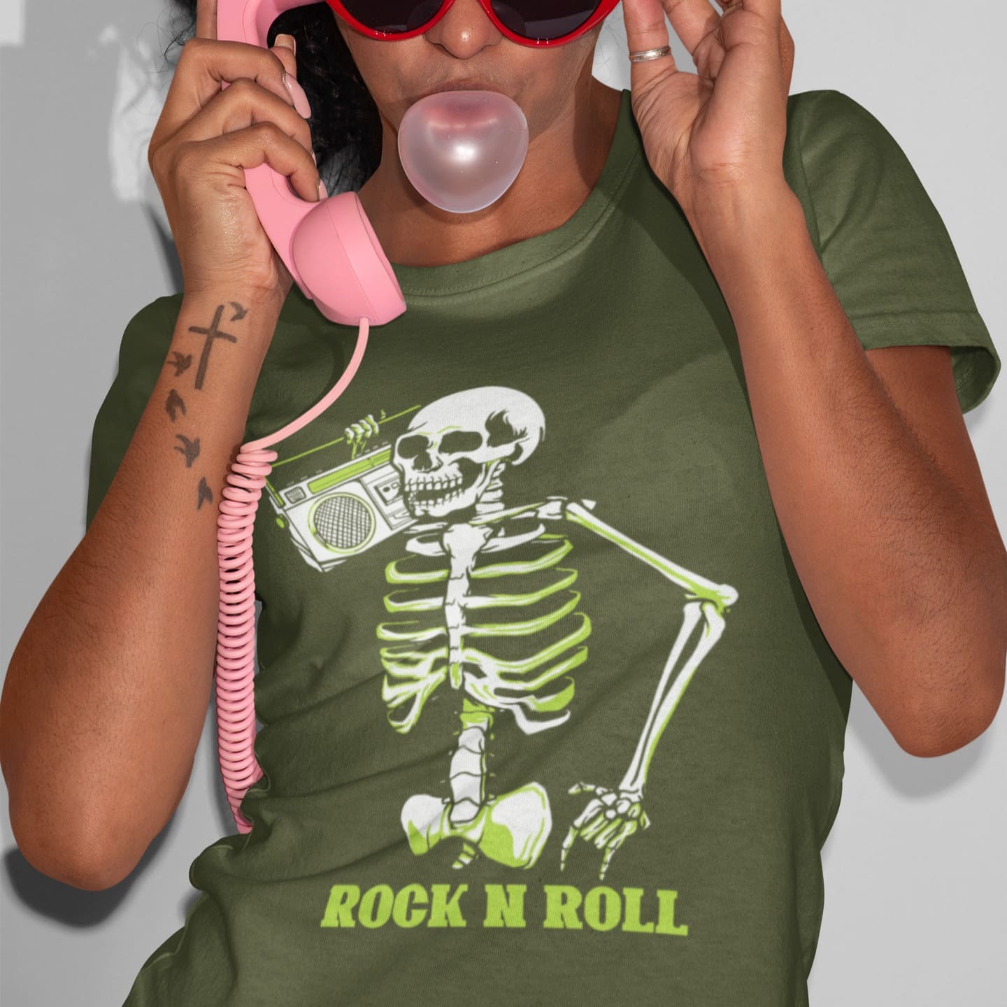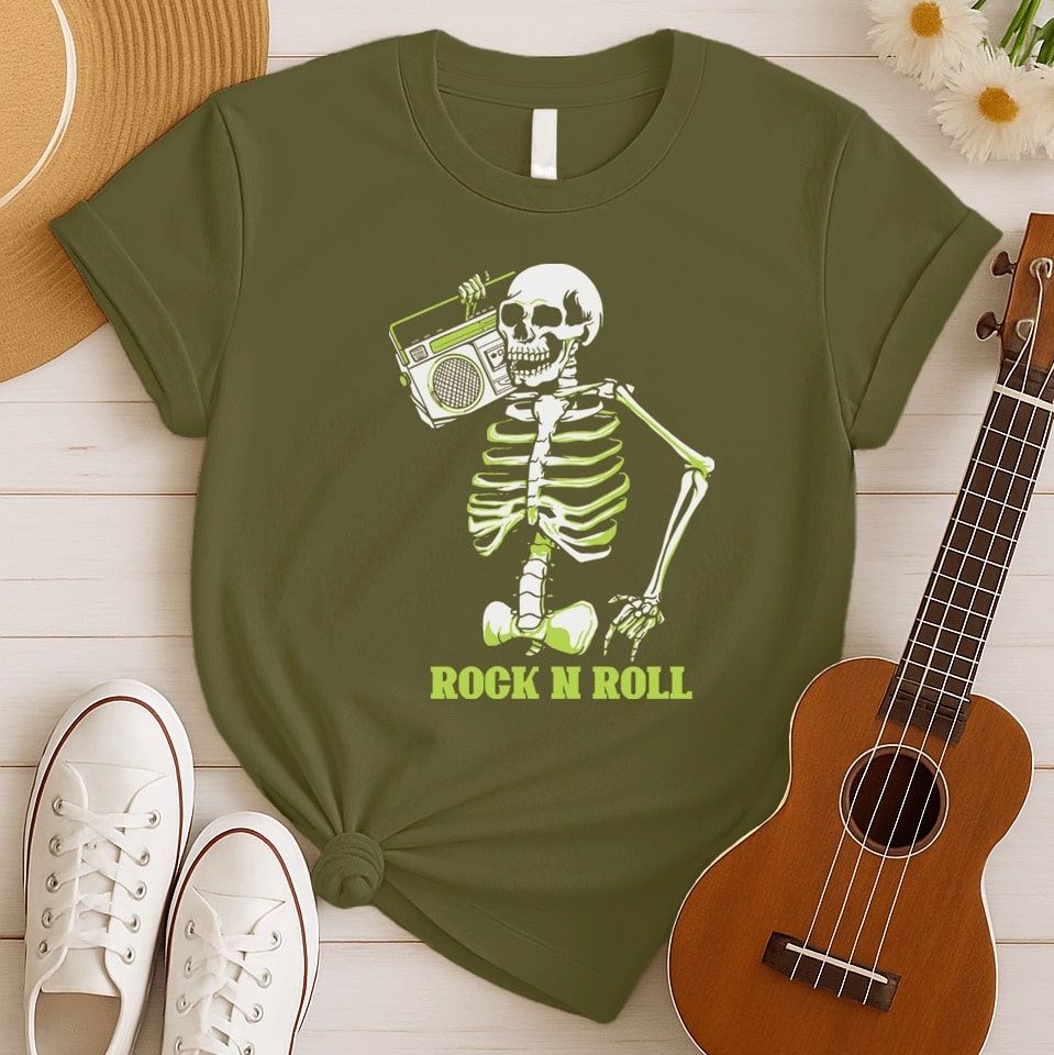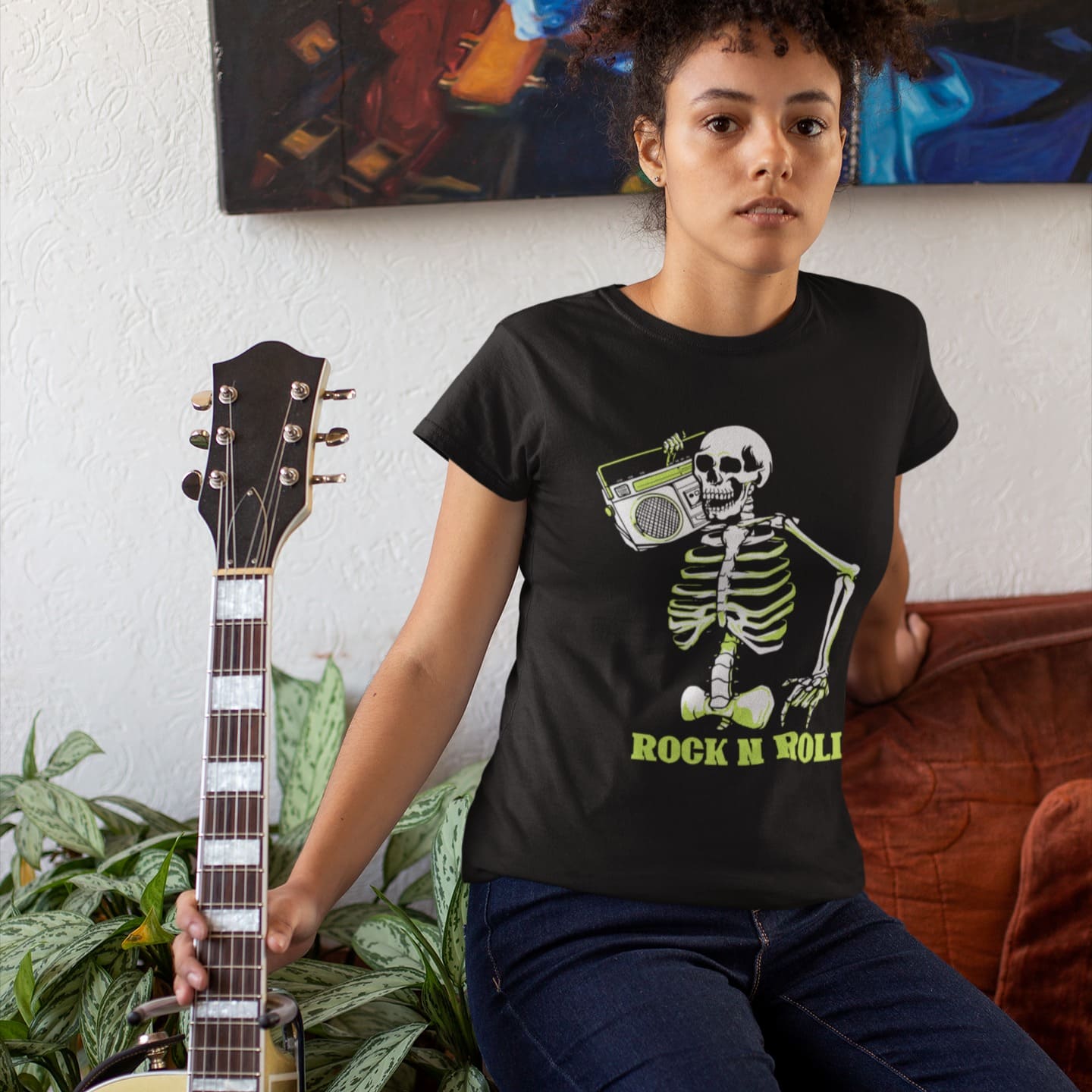 Unleash your undying love for rock and roll with this radical design, featuring a groovy skeleton rocking out with an old-school boombox. It's a timeless statement for music fans, rock enthusiasts, and anyone whose soul lives for the beat. This unique music graphic captures the spirit of pure rock energy.
