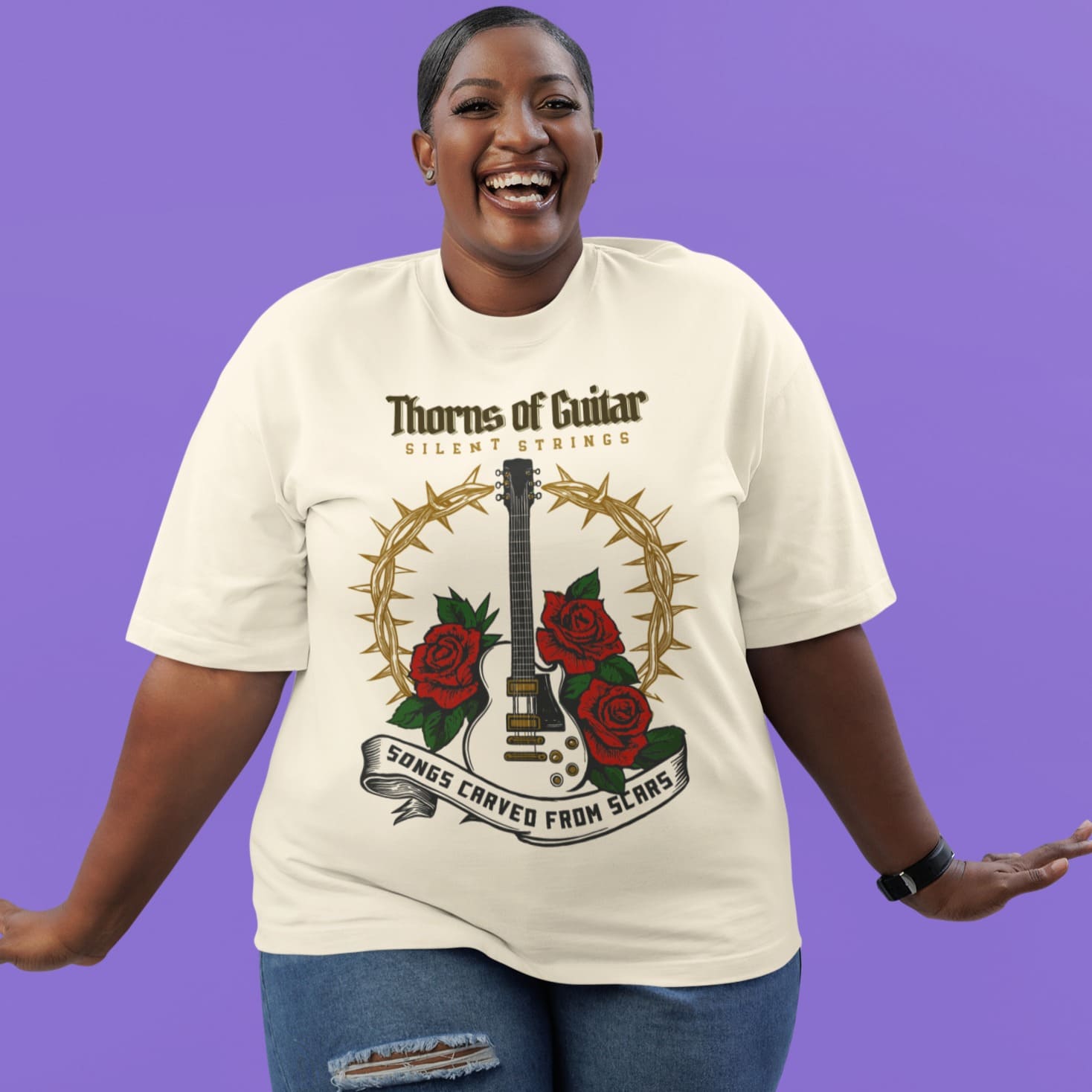 Unleash your raw energy with the Thorns of Guitar T-shirt. This fierce design features a guitar and rose graphic encircled by a crown of thorns and the bold text, "Songs Carved From Scars." Perfect for fans of rock, metal, and dark music culture.