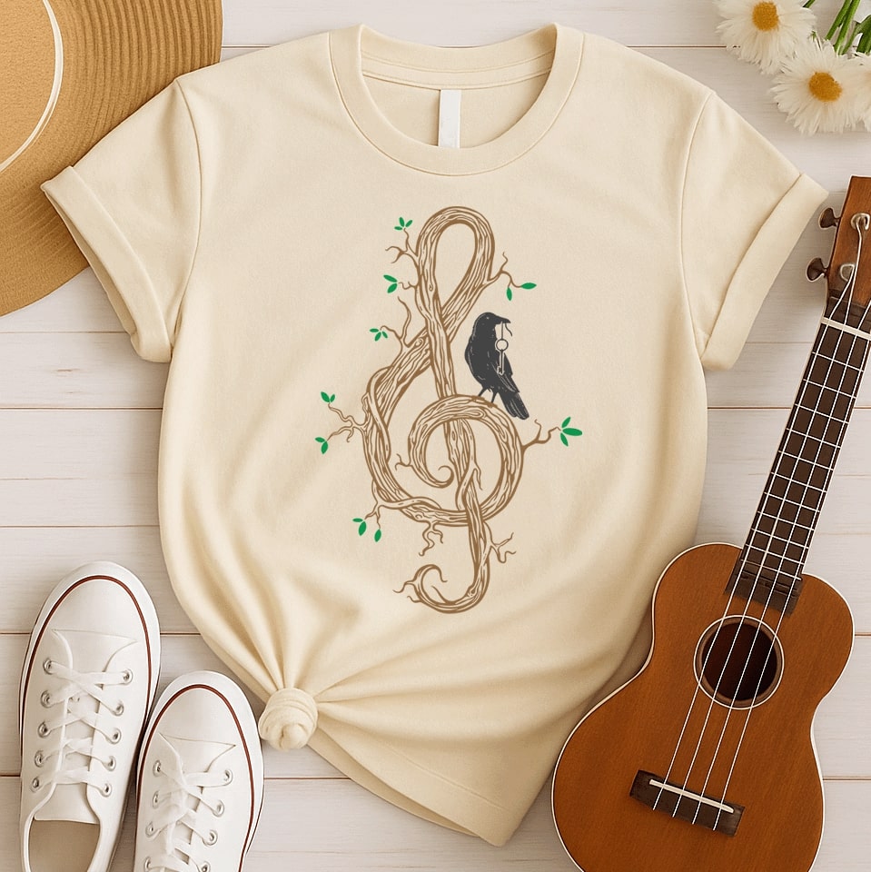 A stunning and unique illustration that merges music and nature! This design features a treble clef stylized as a leafy tree or vine, with a crow sitting within its branches. The perfect organic art gift for musicians, music teachers, nature lovers and anyone who loves bohemian or symbolic apparel.
