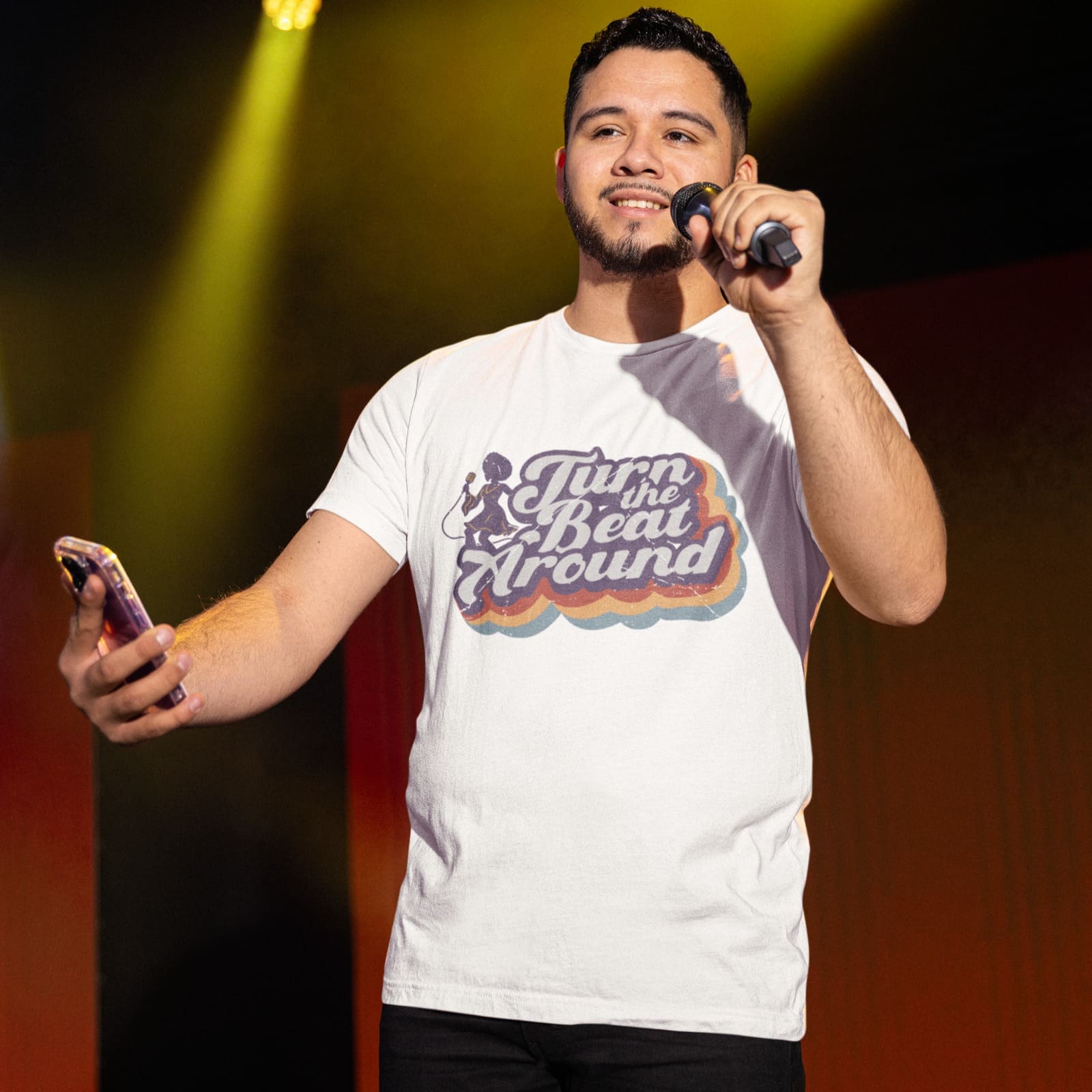 Hit the dance floor! The Turn the Beat Around T-shirt celebrates the iconic 1976 disco hit by Vicki Sue Robinson. This groovy 70s Music tee features her silhouette with one of her iconic song "turn the beat around", perfect for fans of classic disco and funk music.
